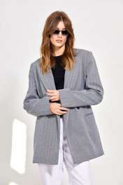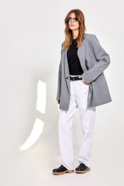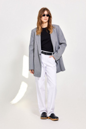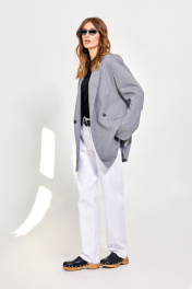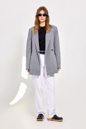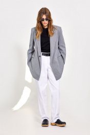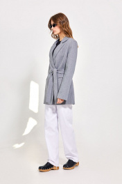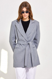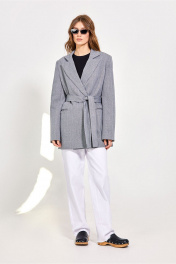 Жакет: - полуприталенный силуэт - пиджачный воротник - спинка со средним швом - карманы без клапанов - застежка на потайные кнопки - без шлёвок, пояс в комплекте - удлинённый, низ прямой