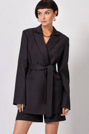 Жакет: - полуприталенный силуэт - пиджачный воротник - спереди вытачки - рукава втачные двухшовные - прорезные карманы - застежка на кнопки - пояс в комплекте - на подкладке - внутренние карманы Шорты: - прямой силуэт - карманы в боковых швах - пояс со шлёвками - застёжка в боковом шве Топ: - прилегающий силуэт - на корсетных косточках - по спинке молния - верх переда усилен поролоновыми чашками