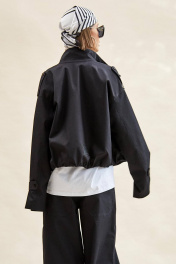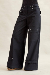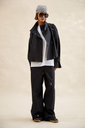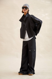 Куртка из джинса: - прямой силуэт; - спущенная линия плеча; - на подкладке; - спереди прямые рельефы; - застежка спереди на два ряда кнопок; - на плечевых швах погоны; - спереди карманы с листочкой; - воротник-стойка с патами, застегивающимися на прямоугольную пряжку; - рукава прямые двухшовные с патами по низу; - низ по спинке и по бокам оформлен сборкой; - на спинке аппликация с логотипом. Брюки из джинса: - широкие, расширены от бедра; - посадка низкая; - широкий пояс-кокетка с двумя рядами шлевок и патами на кнопках спереди; - спереди и сзади кокетки; - в боковых швах карманы; - спереди декоративные клапаны с кнопками; - сзади карманы с клапанами и кнопками; - спереди на колене накладной карман с клапаном на кнопках; - застежка спереди на молнию и три потайных кнопки на поясе; - спереди по низу паты со шлевками и кнопками.