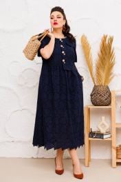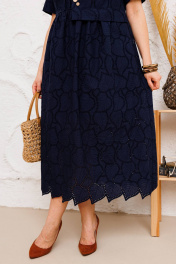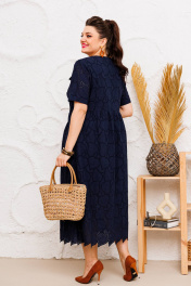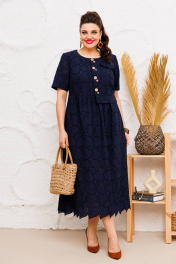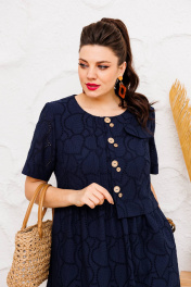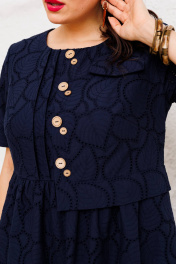 Платье женское отрезное по линии талии, длиной ниже колена, предназначено для повседневной носки. Верхняя часть переда с двумя нагрудными вытачками, с двумя односторонними зафиксированными складками справа, со средним швом с односторонней зафиксированной складкой, с цельнокроеной отлетной баской, с фигурным настрочным клапаном слева. Складка среднего шва декорируется 4-мя большими и 4-мя маленькими декоративными пуговицами. Нижняя часть переда с легкой сборкой по верхнему срезу. Верхняя часть спинки с двумя талиевыми вытачками, верхний срез нижней части спинки с легкой сборкой, расположенной между вытачками верхней части. В боковых швах платья обработаны карманы. Горловина круглая, обтачная, без воротника. Рукав втачной, короткий, одно шовный. Платье на хлопковой подкладке. Платье с плечевыми накладками. Длина спинки 115 см. Длина рукава 28 см