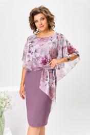 Платье женское относится к нарядной торжественной одежде. Платье полуприлегающего силуэта, с отлетной накидкой длиной за колено. Перед с двумя нагрудными вытачками, с двумя талиевыми вытачками. Спинка с двумя талиевыми вытачками и средним швом, заканчивающимся шлицей. Застежка на потайную тесьму-молнию в среднем шве спинки. Горловина круглая, обтачная, без воротника, по горловине закреплена накидка. Слева на уровне линии талии отделочным хлястиком, декорированным тесьмой накидка закрепляется на платье, нижняя часть накидки закреплена в левом боковом шве. Накидка с фигурным низом. Платье без рукавов. Длина спинки 103 см. Длина накидки от горловины 38 см