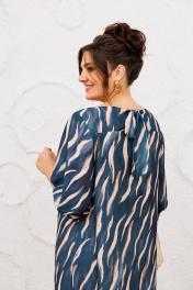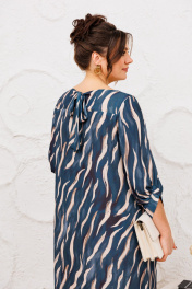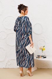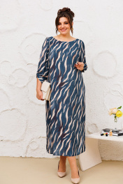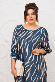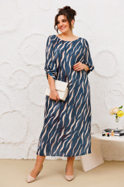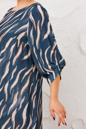 Платье женское относится к нарядной торжественной одежде. Платье женское прямого силуэта, длиной до нижней части икры. Перед с 2-мя нагрудными вытачками. Спинка с отрезной кокеткой с фигурным обтачным разрезом, фиксирующимся по горловине на 2-е обточные завязки. Горловина круглая, обтачная, без воротника. Рукав втачной, одношовный, длиной 3/4 с фигурным низом с 14-ю односторонними складками (по 7 с каждой стороны от угла манжеты), с притачной манжетой из отделочной ткани. Боковые швы с разрезами. Платье на подкладке. Платье без плечевых накладок.