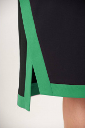 Платье женское для повседневной носки. Платье женское прямого силуэта, длиной за колено, с фигурным низом "ступенька". Перед с двумя нагрудными вытачками. Спинка цельнокроеная. Боковые швы с фигурными разрезами. Разрезы и низ платья с приточными планками из отделочной ткани. Горловина круглая с втачной стойкой. Платье со спущенным плечом. Рукав втачной, длиной 7/8, с приточной вертикальной планкой из отделочной ткани по центру и приточной манжетой из отделочной ткани. Платье без плечевых накладок. Длина рукава от горловины 60 см, длина спинки 103 см.