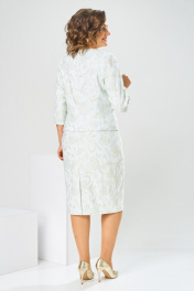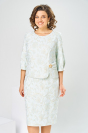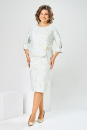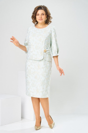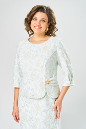 Платье женское, относится к нарядной торжественной одежде. Платье женское полу прилегающего силуэта, длиной за колено, выполнено в виде имитации костюма. Лиф платья отлетной. Перед с 2-мя отрезными бочками, левый бочок с отделочным фигурным поясом, декорированным объёмным украшением, шов притачивания левого бочка с разрезом с закруглёнными концами. Спинка лифа со средним швом и 2-мя отрезными бочками. Лиф платья на подкладке, к которой крепится нижняя часть платья (юбка). Переднее полотнище нижней части с 2-мя таллиевыми вытачками. Заднее полотнище с 2-мя таллиевыми вытачками и средним швом, заканчивающимся шлицей. Нижняя часть платья на подкладке. Горловина круглая, обтачная, без воротника. Застёжка на потайную тесьму-молнию в среднем шве спинки. Рукав втачной, одно шовный, длиной 3/4. Низ рукава со встречной складкой, обточной, складка декорирована пришивной пуговицей. Платье с плечевыми накладками. Длина спинки 104 см, длина рукава 42 см.