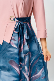 Платье женское относится к нарядной торжественной одежде, но может использовано и при повседневной носке. Платье женское, отрезное по линии талии, расширенное к низу, длиной за колено. Верхняя часть переда с отрезными рельефами, выходящими из плечевых швов, центральная часть с зафиксированным запахом. Верхняя часть спинки со средним швом и 2-мя рельефами, выходящими из плечевых швов. Горловина с V-образным вырезом, фигурная, обточная без воротника. Нижняя часть переда и нижняя часть спинки цельнокроеные, выполнены из отделочной ткани. Шов соединения верхней и нижней частей платья декорирован притачной фигурной отлетной баской. Платье с декоративным поясом из отделочной ткани, закреплённом на левом боковом шве и фиксирующимся в бант через металлическую пробивную блочку на центральной части переда. Рукав одно шовный втачной, длиной до локтя, с притачной фигурной манжетой. Платье с плечевыми накладками. Нижняя часть на подкладке. Длина платья 112 см, длина рукава 33 см.