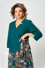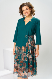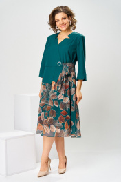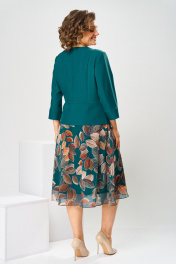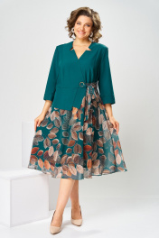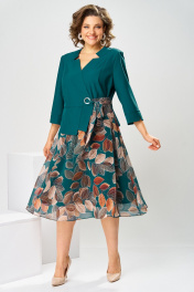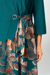 Платье женское относится к нарядной торжественной одежде, но может использовано и при повседневной носке. Платье женское, отрезное по линии талии, расширенное к низу, длиной за колено. Верхняя часть переда с отрезными рельефами, выходящими из плечевых швов, центральная часть с зафиксированным запахом. Верхняя часть спинки со средним швом и 2-мя рельефами, выходящими из плечевых швов. Горловина с V-образным вырезом, фигурная, обточная без воротника. Нижняя часть переда и нижняя часть спинки цельнокроеные, выполнены из отделочной ткани. Шов соединения верхней и нижней частей платья декорирован притачной фигурной отлетной баской. Платье с декоративным поясом из отделочной ткани, закреплённом на левом боковом шве и фиксирующимся в бант через металлическую пробивную блочку на центральной части переда. Рукав одно шовный втачной, длиной до локтя, с притачной фигурной манжетой. Платье с плечевыми накладками. Нижняя часть на подкладке. Длина платья 112 см, длина рукава 33 см.