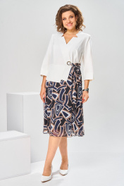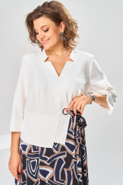 Платье женское относится к нарядной торжественной одежде, но может использовано и при повседневной носке. Платье женское, отрезное по линии талии, расширенное к низу, длиной за колено. Верхняя часть переда с отрезными рельефами, выходящими из плечевых швов, центральная часть с зафиксированным запахом. Верхняя часть спинки со средним швом и 2-мя рельефами, выходящими из плечевых швов. Горловина с V-образным вырезом, фигурная, обточная без воротника. Нижняя часть переда и нижняя часть спинки цельнокроеные, выполнены из отделочной ткани. Шов соединения верхней и нижней частей платья декорирован притачной фигурной отлетной баской. Платье с декоративным поясом из отделочной ткани, закреплённом на левом боковом шве и фиксирующимся в бант через металлическую пробивную блочку на центральной части переда. Рукав одно шовный втачной, длиной до локтя, с притачной фигурной манжетой. Платье с плечевыми накладками. Нижняя часть на подкладке. Длина платья 112 см, длина рукава 33 см.