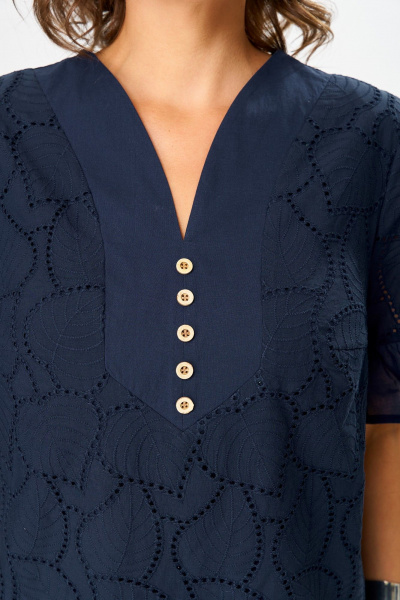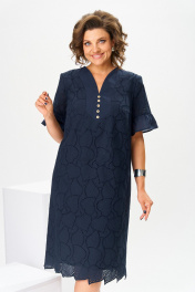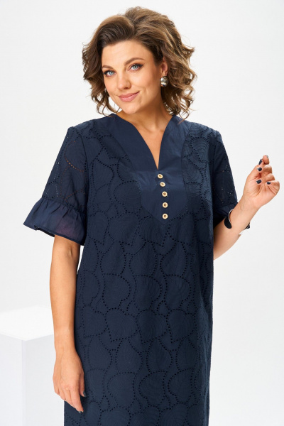 Платье предназначено для повседневной носки. Платье женское, полу прилегающего силуэта, длиной ниже колена. Перед с 2-мя нагрудными вытачками, с втачной фигурной планкой по горловине, декорированной с 5-ю пришивными пуговицами. Планка из отделочной ткани. Спинка со средним швом и 2-мя таллиевыми вытачками. Горловина фигурная, обточная без воротника. Застёжка на потайную тесьму молнию в среднем шве спинки. Рукав втачной, одно шовный, короткий, с притачной рюшей из отделочной ткани. Платье на подкладке. Платье с плечевыми накладками. Длина платья по спинке 105 см. Длина рукава 29,5 см.