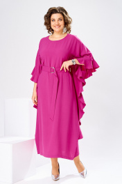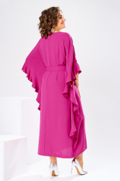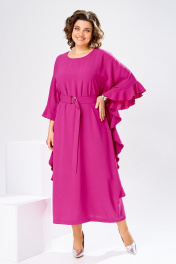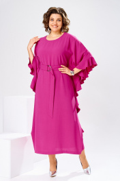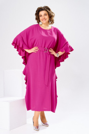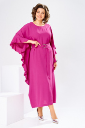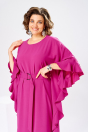 Платье женское, относится к нарядной торжественной одежде. Платье пончо свободного кроя, длинное. Перед цельнокроеный. Спинка со средним швом, вверху с разрезом, фиксирующимся по горловине на 1-ну навесную петлю и 1-ну пришивную пуговицу. Горловина круглая, обточная, без воротника, по переду горловины отделочная строчка 0,6 см. Рукав цельнокроеный удлинённый. Низ рукава и боковые швы декорированы приточной оборкой. По боковым швам зафиксирован уровень пройм и место расположения петель на уровне линии талии отделочными строчками. К платью прилагается съёмный пояс с пряжкой, фиксируемые на платье в петли на уровне линии талии. Платье без плечевых накладок. Длина спинки платья 132 см, ширина на уровне глубины проймы 66 см, ширина по линии талии 66 см, ширина плеча+длина рукава 56,5 см.