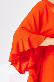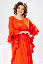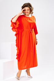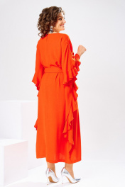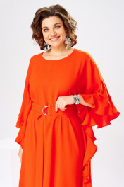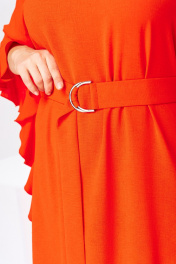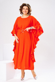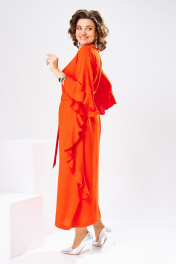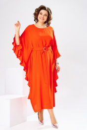 Платье женское, относится к нарядной торжественной одежде. Платье пончо свободного кроя, длинное. Перед цельнокроеный. Спинка со средним швом, вверху с разрезом, фиксирующимся по горловине на 1-ну навесную петлю и 1-ну пришивную пуговицу. Горловина круглая, обточная, без воротника, по переду горловины отделочная строчка 0,6 см. Рукав цельнокроеный удлинённый. Низ рукава и боковые швы декорированы приточной оборкой. По боковым швам зафиксирован уровень пройм и место расположения петель на уровне линии талии отделочными строчками. К платью прилагается съёмный пояс с пряжкой, фиксируемые на платье в петли на уровне линии талии. Платье без плечевых накладок. Длина спинки платья 132 см, ширина на уровне глубины проймы 66 см, ширина по линии талии 66 см, ширина плеча+длина рукава 56,5 см.