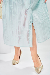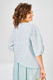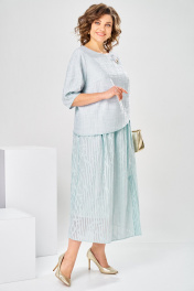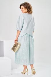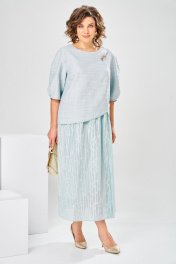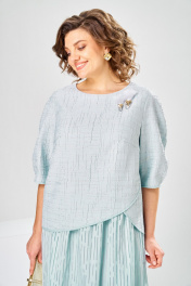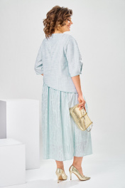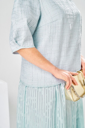 Платье женское, относится к нарядной одежде. Платье женское, полу прилегающего силуэта, длиной ниже колена, отрезное по линии талии выполнено в виде имитации костюма. Верхняя часть платья отлетная с фигурным низом. Перед с 2-мя нагрудными вытачками. Спинка со средним швом. Левый шов с надстрочным клином. Низ верхней части переда и спинки обработан косой бейкой. Горловина круглая, обточная, без воротника. Застёжка на потайную тесьму-молнию в среднем шве спинки. Рукав втачной полу реглан, длиной ниже локтя, низ рукава со встречной складкой, обработан косой бейкой. Нижняя часть платья из отделочной ткани. Переднее полотнище с притачным бочком, шов притачивания заканчивается шлице. Заднее полотнище цельнокроеное. По верхнему срезу (линии талии) нижняя часть со сборкой. Платье на подкладке. Платье без плечевых накладок. Перед платьем декорирован съёмным украшением. Длина спинки платья 126 см, длина рукава 42 см.