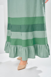 Платье женское, предназначено для повседневной носки. , так же может использоваться как нарядная одежда. Платье женское, длинное, слегка расширенное к низу. Перед с 2-мя отрезными бочками от подреза на уровне линии талии. Спинка отрезная по линии талии. Шов соединения деталей платья платья по линии талии с надстрочной кулисой собранной на эластичную тесьму. Низ платья с 4-мя горизонтальными притачными планками, чередующимися по цвету, на 3-х планках по 4-и односторонних маленьких складки по переду и спинки, формирующими расширение к низу. Низ платья с притачным воланам, с лёгкой сборкой по верхнему срезу. Горловина круглая, без воротника. Рукав цельнокроеный, короткий. Горловина и низ рукава обработаны косой бейкой. Платье со съёмным украшением. Платье без плечевых накладок. Длина спинки платья 138 см, ширина рукава под проймой 23 см.