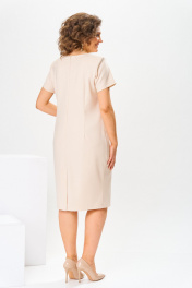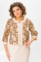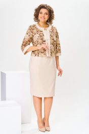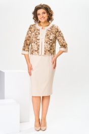 Комплект женский, относится к торжественно-нарядной одежде. Комплект женский, 2-х предметный, жакет и платье. Жакет женский прямого силуэта, длиной до линии талии, выполнен из кружевного полотна. Перед с 2-мя нагрудными вытачками, с 2-мя притачными вертикальными планками, с притачными планками по горловине. Спинка с притачной планкой по горловине. Горловина круглая, обточная, без воротника. Застёжка на декоративный пришивной крючок. Рукав втачной одно шовный, длиной 3/4 с притачной манжетой. Жакет без плечевых накладок. Платье женской длиной за колено, полу прилегающего силуэта. Перед с 2-мя отрезными бочками. Спинка с 2-мя таллиевыми вытачками, со средним швом, заканчивающимся шлицей. Горловина круглая, обточная, без воротника. Застёжка на потайную тесьму-молнию в среднем шве спинки. Рукав втачной, короткий, одно шовный. Платье с плечевыми накладками. Длина спинки жакета 45 см, длина рукава 41 см. Длина спинки платья 100 см, длина рукава 19 см.