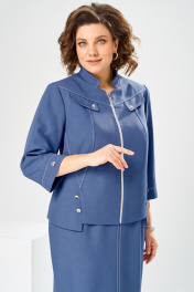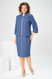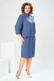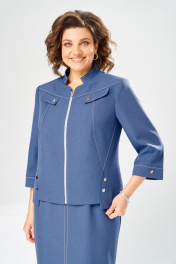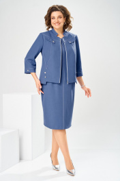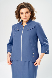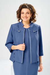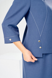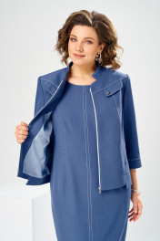 Комплект предназначен для повседневной носки. Комплект женский 2-х предметный жакет и платье. Жакет женский полу прилегающего силуэта, длиной до линии бёдер с фигурным низом "ступенька". Перед с 2-мя отрезными кокетками, с 2-мя притачными фигурными планками, зафиксированными на перед пришивными пуговицами, с 2-мя притачными фигурными рельефами, с 2-мя фигурными притачными бочками, декорированными пришивными пуговицами. Спинка со средним швом и 2-мя притачными бочками. Горловина круглая с втачной стойкой, вырез фигурный. Застёжка центральная бортовая на разъёмную металлическую тесьму- молнию. Рукав втачной, 2-х шовный, длиной 3/4, с притачной манжетой, декорированной пришивной пуговицей. По швам соединения деталей переда притачивания бочков спинки, по шву притачивания манжеты по краю платья, по краю стойки отделочная строчка контрарными нитками-0,6 см. Жакет с плечевыми накладками. Жакет на притачной подкладке. Платье женское, полу прилегающего силуэта, длиной за колено. Перед со средним швом, декорированным строчками шириной 0,6 см контрарными нитками, с 2-мя отрезными таллиевыми вытачками. Спинка с 2-мя таллиевыми вытачками, со средним швом, заканчивающимся шлицей. Горловина круглая, обточная, без воротника. Застёжка на потайную тесьму-молнию в среднем шве спинки. Рукав втачной, короткий, одно шовный. Платье без плечевых накладок. Длина спинки жакета 59 см. длина рукава 48 см. Длина спинки платья 104 см, длина рукава 17 см