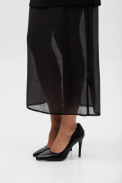 Эта оригинальная и элегантная юбка станет ярким акцентом вашего гардероба, идеально подходя для создания смелых и запоминающихся луков. Она сочетает в себе строгость классического стиля и нотку современной дерзости, что делает её универсальной для различных случаев — от вечерних выходов до модных мероприятий. Основные особенности: Цвет: глубокий чёрный, который подчёркивает изысканность и легко сочетается с другими элементами одежды; Дизайн: верхняя часть юбки выполнена из плотной ткани, а нижняя часть — из лёгкой, полупрозрачной ткани, что добавляет образу лёгкость и интригу; Длина: миди, что делает юбку универсальной для различных стилей и случаев; Крой: прямой, слегка расклёшенный книзу, что позволяет комфортно носить её в течение всего дня или вечера. С чем носить: Юбка отлично сочетается с облегающими топами, блузами с воротником или даже с классическими рубашками. Для завершения образа подойдут туфли на каблуке или стильные ботфорты, а также минималистичные аксессуары, которые подчеркнут вашу индивидуальность. Уход за изделием: Рекомендуется стирка в деликатном режиме при температуре до 30°C. Не использовать отбеливатели. Сушить в расправленном виде, избегая прямых солнечных лучей.