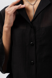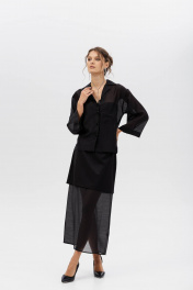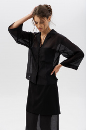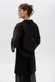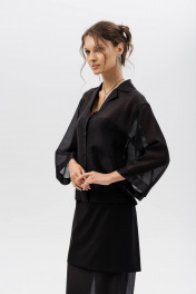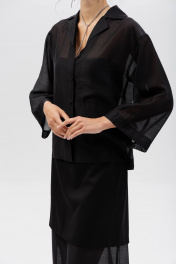Создайте элегантный и современный образ с этой роскошной блузкой, которая идеально подойдёт для деловых встреч, вечерних выходов или особых мероприятий. Описание блузы: Цвет: классический чёрный, который легко сочетается с любыми аксессуарами и обувью; Дизайн: блуза с воротником и застёжкой на пуговицы, дополненная прозрачными рукавами из лёгкой, полупрозрачной ткани, что придаёт образу лёгкость и женственность; Материал: комбинация плотной и полупрозрачной ткани, обеспечивающая комфорт и стильный внешний вид; Универсальность: подходит для создания как деловых, так и вечерних луков. Описание юбки: Цвет: чёрный, подчёркивающий стройность и элегантность; Эта стильная блуза станет идеальным дополнением вашего гардероба, сочетая в себе женственность, элегантность и современный дизайн. Она подойдёт как для деловых встреч, так и для вечерних выходов, добавляя образу лёгкость и изысканность. Основные особенности: Цвет: классический чёрный, который легко сочетается с любыми аксессуарами и элементами одежды; Дизайн: блуза с воротником и застёжкой на пуговицы, дополненная прозрачными рукавами из лёгкой, полупрозрачной ткани, что придаёт образу лёгкость и женственность; Материал: комбинация плотной и полупрозрачной ткани, обеспечивающая комфорт и стильный внешний вид; Крой: свободный, но в то же время подчёркивающий силуэт, что делает блузу универсальной для различных стилей и случаев. С чем носить: Блуза отлично сочетается с юбками-карандаш, брюками классического кроя или джинсами. Для завершения образа добавьте туфли на каблуке или лодочки, а также минималистичные украшения, такие как тонкое ожерелье или серьги. Уход за изделием: Рекомендуется стирка в деликатном режиме при температуре до 30°C. Не использовать отбеливатели. Сушить в расправленном виде, избегая прямых солнечных лучей.