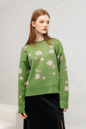Джемпер прямого силуэта. Джемпер очень приятный к телу, вывязан жаккардовым переплетением. По переду, спинке и рукавам вывязаны цветы. Рукав втачной, длинный. Вырез горловины круглый обработан прикеттлёванной бейкой. Он нарядный сам по себе, так что после работы смело иди на встречу с подругой в кафе. Это базовый джемпер, который просто необходим в наше время!
