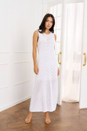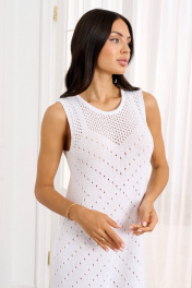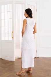 Это элегантное вязаное платье станет изысканным дополнением вашего гардероба. Выполненное из мягкой пряжи с ажурным узором, оно имеет круглый вырез и боковой разрез, придающий образу легкость и женственность. Платье идеально подходит для создания стильных и комфортных образов как на каждый день, так и для особых случаев. Особенности: Материал: 100% натуральная пряжа Фасон: без рукавов, круглый вырез, боковой разрез Длина: до середины икры Подходит для любого сезона Это платье станет отличным выбором для тех, кто ценит комфорт и стиль.