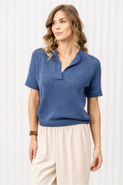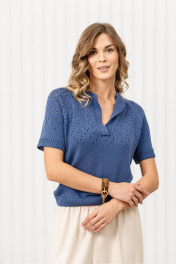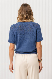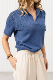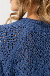 Джемпер прямого силуэта связан из пряжи, в состав которой входит 50% хлопка,50% ПАН. Джемпер очень мягкий и приятный к телу, вывязан переплетением кулирная гладь, переходящая к плечевому поясу в ажур. Рукав реглан, длиной до локтя. Круглая горловина и разрез по переду обработаны накеттлеванной бейкой. Низ изделия, низ рукава и бейка горловины связаны переплетением ластик 1*1.