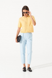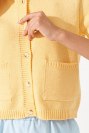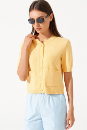 Комфортный жакет с коротким рукавом и застёжкой на пуговицы Этот стильный и солнечный кардиган из мягкой трикотажной пряжи станет идеальным дополнением вашего весенне-летнего гардероба. Насыщенный жёлтый цвет подарит хорошее настроение и добавит яркости вашему образу. Основные особенности: Цвет: жёлтый и молочный — актуальные и сочные оттенки, который привлекают внимание и поднимают настроение; Материал: мягкий трикотаж, приятный на ощупь, обеспечивает комфорт в течение всего дня; Дизайн: короткий рукав, застёжка на пуговицы, классический крой с небольшими накладными карманами; Универсальность: отлично сочетается с брюками, юбками, джинсами и шортами, подходит для создания как повседневных, так и стильных летних луков. Идеальный выбор для тех, кто любит яркие акценты и ценит комфорт! Кардиган станет незаменимой вещью в вашем гардеробе, добавляя уюта и стиля.
