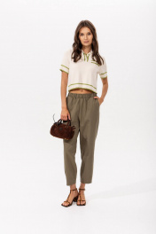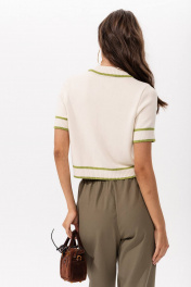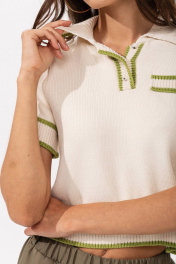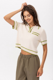 Модный трикотажный топ поло с контрастной отделкой Этот стильный топ из мягкого трикотажа с классическим воротником-поло станет ярким акцентом в вашем гардеробе. Сочетание нежного молочного цвета с зелёными акцентами придаёт модели свежесть и оригинальность. Основные особенности: Цвет: золотая олива с молочным и молочный с золой оливой — универсальное и модное сочетание, подходящее для любого сезона; Материал: мягкий трикотаж — приятная на ощупь ткань, обеспечивающая комфорт и свободу движений; Дизайн: воротник-поло, короткие рукава с контрастными зелёными полосками и слегка укороченный крой; Универсальность: отлично сочетается с брюками, юбками, джинсами и шортами, подходит для создания как повседневных, так и стильных луков. Идеальный выбор для тех, кто ценит стиль, комфорт и оригинальный дизайн! Этот топ станет незаменимой вещью в вашем гардеробе.