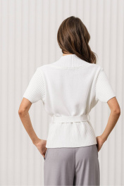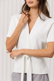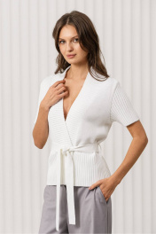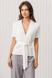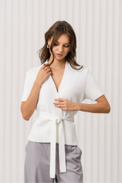 Этот стильный и женственный жакет станет отличным дополнением вашего гардероба! Он идеально подходит для создания утончённых и модных луков, сочетая в себе комфорт, элегантность и оригинальный дизайн. Топ отлично впишется в офисный стиль, деловые встречи или вечерние мероприятия. Цвет: белый, который добавляет образу свежесть и лёгкость; Дизайн: топ с V-образным вырезом и короткими рукавами. Ребристая текстура и завязка на поясе придают изделию оригинальность и женственность, подчёркивая фигуру; Материал: мягкая и приятная на ощупь трикотажная ткань, которая обеспечивает комфорт в течение всего дня; Крой: слегка приталенный, что делает топ универсальным для различных стилей и случаев. С чем носить: Топ отлично сочетается с брюками свободного кроя, как на фото, юбками или джинсами. Для завершения образа подойдут туфли на каблуке, лодочки или стильные сандалии. Дополните образ минималистичными аксессуарами, такими как тонкий браслет или серьги. Уход за изделием: Рекомендуется стирка в деликатном режиме при температуре до 30°C. Не использовать отбеливатели. Сушить в расправленном виде, избегая прямых солнечных лучей.