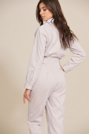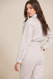 Комбинезон в полоску с поясом по талии. Прекрасный комбинезон выполнен из плотного хлопка. Застежка по переду на пуговицы по планке. Карманы в боковых швах. Отделка на воротнике, планке и на манжетах в брюках выполнены из контрастного белого хлопка. Пояс в боковых швах выполнен так, что прекрасно подчеркнёт достоинства вашей фигуры и скроет недостатки. По спинке на талии красивые вытачки.