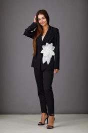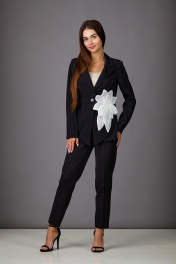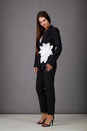 Комплект женский, состоящий из жакета и брюк, выполнен из стрейчевой костюмной ткани на подкладке. Жакет полуприталенного силуэта с рельефами по переду и спинке, отрезной по линии талии, с баской. Карманы-эмитация. Воротник - пиджачного типа. Рукава - втачные, двухшовные. Застежка на 2 пуговицы. Съемная брошь-цветок входит в комплект. Брюки слегка заужены к низу, с поясом. Застегиваются на молнию по переду и одну пуговицу.