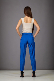 Брюки женские из костюмной ткани. Посадка- средняя. Слегка заужены к низу, с наклонными карманами и регулируемым резинкой поясом. Застегиааются на молнию по переду и одну пуговицу.