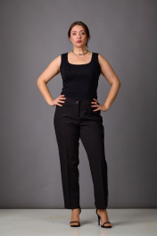 Брюки слегка заужены к низу, с поясом. Посадка-средняя. Застегиваются на молнию по переду и одну пуговицу. Серебряный кант по боковым швам добавит стиля и элегантности.
