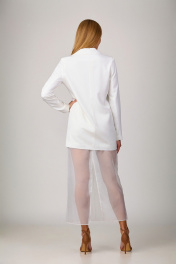 Комплект-тройка , состоящий из пиджака, блузы-топа и юбки. Пиджак из костюмной ткани на подкладке с расширенной линией плеч, с отрезными бочками по переду и спинке и вытачками по переду. Воротник-с отложными лацканами пиджачного типа. По переду - прорезные карманы с клапанами. Рукава длинные, двухшовные. Пиджак застегивается на три пуговицы. Блуза-топ из костюмной ткани на подкладке. Крой топа по косой, без молнии, с вытачками по переду. Длина топа-55-58см. Юбка из вуали на короткой подкладке. По поясу юбки – резинка. Шлица в среднем шве сзади. Длина юбки- 97см.Пояс в комплект не входит.