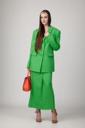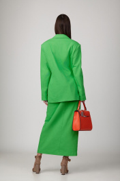 Комплект, состоящий из жакета и юбки, из джинсовой ткани на подкладке. Жакет с расширенной линией плеч, с отрезными бочками по переду и спинке и вытачками по переду. Воротник-с отложными лацканами пиджачного типа. По переду - прорезные карманы с клапанами. Рукава длинные, двухшовные. Жакет застегивается на три пуговицы. Юбка- миди с наклонными карманами и складкой по переду, с широким поясом-обтачкой. Застегиваются на молнию спереди и пуговицу. Цвет молодой травы.