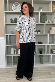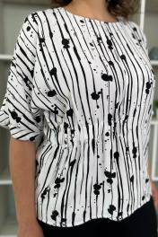 Блузка женская из текстильной ткани ,свободного силуэта. Вырез горловины лодочка. Спущенный рукав оформлен притачной манжетой. Перед блузы оформлен декоротивными подрезами. По талии вставлена резинка. Спинка блузы со средним швом. Длина изделия 65 ± 1 см. Промеры на примере 46 размера: ОГ-100 ±1 см,ОБ-102±1 см 52 размера: ОГ-114 ±1 см,ОБ-115 ±1 см