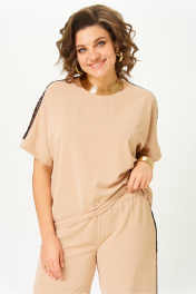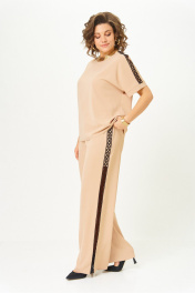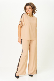 Элегантный женский костюм из легкой, струящейся ткани. Блузка женская из текстильной ткани с цельнокроеным рукавом. Прямого силуэта. По спинке расположен подрез. В шов вставлено кружево. Рукав с манжетой. По плечевому шву вставлено кружево. Вырез лодочка. Обработан притачной бейкой. Длина изделия: по спинке 64±1см, Длина рукава: от крайней точки плеча 38 ± 1см. Промеры на примере 52 размера: ОГ-120 см (спущенное плечо), ОБ-124 см (прямого силуэта) Брюки женские из текстильной ткани, прямого силуэта. По боковым швам вставлено кружево. Пояс брюк на резинке. Длина брюк по боковому шву с учетом пояса 109 ±1 см Ширина брюк по низу меняется от размера ± 2 см от размера Промеры на примере 52 размера: ОБ-120см, ОТ (резинка в свободном состоянии)-82 см.