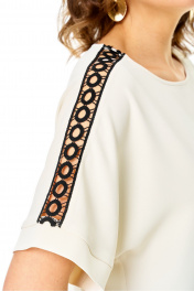 Блузка женская из текстильной ткани с цельнокроеным рукавом. Прямого силуэта. По спинке расположен подрез. В шов вставлено кружево. Рукав 3/4, низ рукава с манжетой. По плечевому шву вставлено кружево. Вырез лодочка. Обработан притачной бейкой. Длина изделия: по спинке 64+-1см Длина рукава: от крайней точки плеча 35 см. Промеры на примере 52 размера ОГ-120 см (спущенное плечо) ОБ- 124 см (прямого силуэта)