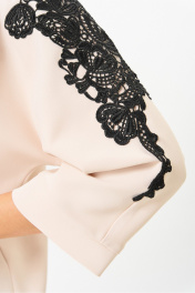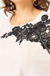 Блузка женская из текстильной ткани с цельнокроеным рукавом. Прямого силуэта. По переду блузки настрочена аппликация. По спинке расположен средний шов. Рукав 3/4, низ рукава с манжетой. Вырез горловины круглый, обработан обтачкой. Блузка застегивается на петлю-пуговицу. Длина изделия: по спинке 64+-1см Длина рукава: от крайней точки плеча 57 см. Промеры на примере 52 размера ОГ-120 см (спущенное плечо) ОБ- 124 см (прямого силуэта)