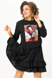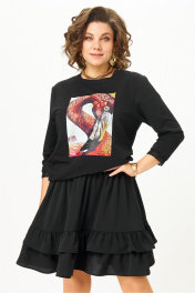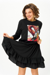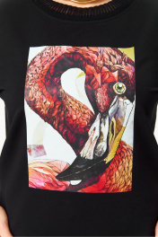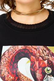 Джемпер женский из трикотажной хлопковой ткани (двунитка). По переду расположен принт. Рукав втачной 3/4, прямой. Вырез горловины круглый. Вырез горловины и низ рукава обработаны довязом. Промеры на примере 50 размера: ОГ 104 см, ОБ 104 см, длина по спинке 63 см. Длина рукава: 47 см.