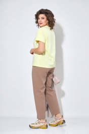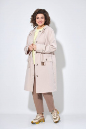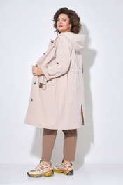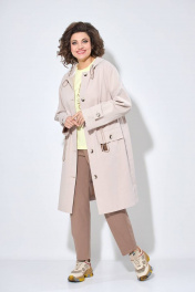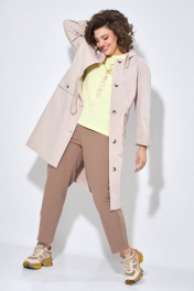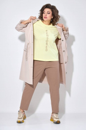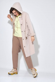 Стильный демисезонный комплект в нежных оттенках состоит из 3 предметов. Плащ прямого силуэта с втачным двухшовным рукавом. По переду карманы с клапаном. Застежка центральная на петли и пуговицы. По спинке средний шов со шлицей. По талии кулиска застегивается шнуром. Майка полуприлегающего силуэта с круглой горловиной. Рукав укороченный, на полочке термопечать. Брюки прямого кроя немного заужены к низу, по боковому отрезная деталь в виде лампаса из основной ткани. Карманы в боковом шве, по низу вытачки, на задней половинке отрезная фигурная кокетка. Пояс на резинке.