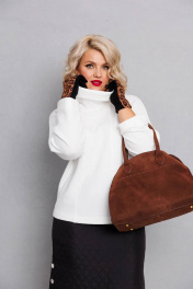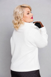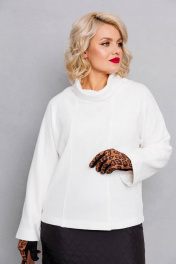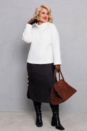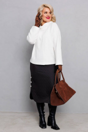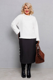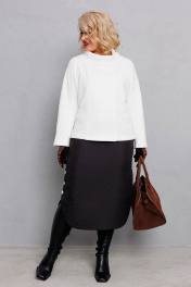 Блуза в молочном оттенке из мягкого объемного трикотажного полотна. Рукав цельнокроенный, воротник хомут. Юбка прямая из ткани «ромбы» стеганое полотно. Застежка сзади на тесьму молнию. Пояс со вставками на резинке по боковой части