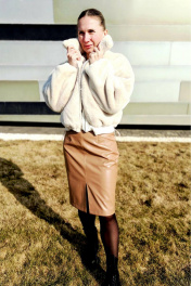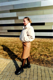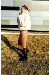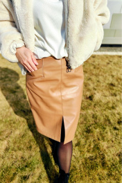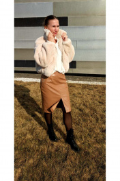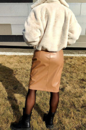 Юбка прямого силуэта, с центральным швом, спереди разрез, отделочные строчки. Материал экокожа на байке, внутри подкладка.