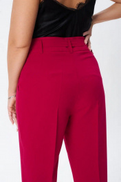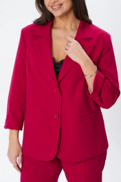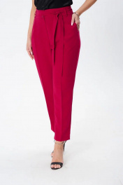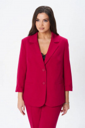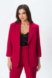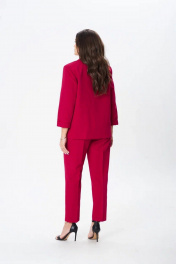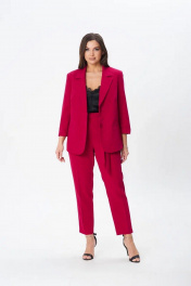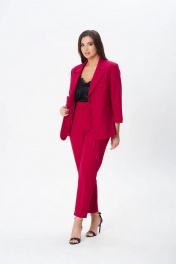 Костюм женский трех-предметный, состоит из жакета, брюк и топа. Жакет однобортный полуприлегающего силуэта с застежкой на две пуговицы. На полочке прорезные карманы с листочкой. Воротник отложной, лацканы классического типа. Рукава длинной 2/4, заканчиваются отложным манжетом. Подкладка только на полочках. Брюки с кокеткой по передней и задней половинкам. Зауженные к низу. На кокетках расположены шлевки, в которые продевается съемный пояс. Застежка брюк на молнию и две пуговицы. Верхний срез брюк обработан обтачкой. Топ прямого силуэта со спущенным плечем, овальным вырезом горловины.