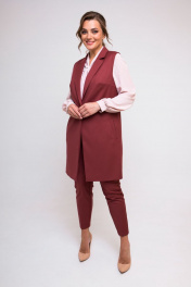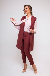 Комплект: жилет, брюки. Жилет прямого силуэта с застёжкой на одну пуговицу. Перед с нагрудными выточками. Жилет с боковыми карманами. Брюки на трикотажном поясе. По задней части - на эластичной езинке, по передней полке застежку на петлю-пуговицу.