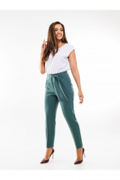 Костюм женский двухпредметный. Жакет полуприлегающего силуэта с застежкой на 2 пуговицы. В жакете прорезные карманы с листочкой. Рукава длинной 3/4 с отложной манжетой. Жакет на подкладке. Брюки зауженные к низу с застежкой на молнию и съемным поясом.