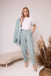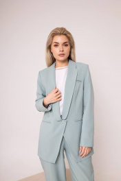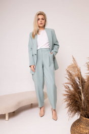 Костюм. Жакет для стильных женщин, полуприлегающего силуэта из костюмной ткани. . Перед с центральной застежкой на одну петлю-пуговицу. По переду боковые функциональные карманы. С левой стороны карман – «обманка». Спинка со средним швом, переходящим в шлицу. Рукава втачные двухшовные. Воротник цельнокроенный, шалевый. Жакет на подкладке. Модные женские брюки – «бананы» свободного кроя, зауженные к низу из костюмной ткани. . На переднем полотнище вертикальная складка. На заднем – вытачки. В боковых швах расположены карманы. Брюки с застежкой спереди на молнию и одну петлю-пуговицу.