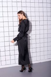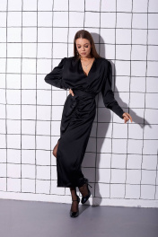 Элегантное, длинное платье из струящейся ткани с ненавязчивым блеском прилегающего силуэта. В платье V-образного вырез, рукав втачной, длинный, на манжете, застёгивается на пуговицы. Линия плеча расширена. Платье имеет потайную застёжку молнию и отдельный декоративный пояс. Замеры: длина: 133см длина рукава: 69см
