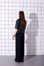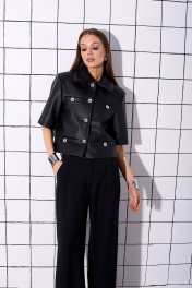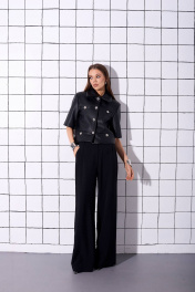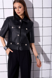 Жакет прямого кроя, укороченный, на подкладке, выполнен из искусственной кожи. Рукав втачной, короткий, с плечевой накладкой. На переде жакета расположены декоративные прорезные карманы с листочкой и декоративными пуговицами. Замеры: длина: 53см длина рукава: 31см