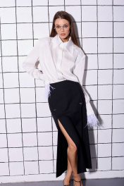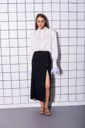 Юбка прямого силуэта, длина миди, с двумя разрезами по переду и декоративными пуговицами. Застежка по спинке на потайную молнию. Замеры: длина: 85см