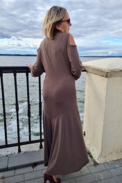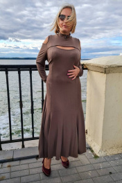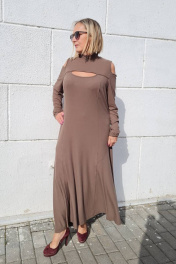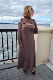 Платье полуприлегающего силуэта, с расширением к низу. Втачной узкий рукав, с вырезом на верхней части. Спинка со швом по центру. Низ изделия также расширен декоративными рельефами. На переде платья, выше груди - вырез "окно". Воротник-стойка с декором из бусин. Предлагается в качестве нарядного и для каждого дня. Длина спинки по шву примерно 118,0 - 120,0 см. Комфортно и тактильно приятно.