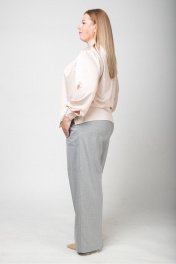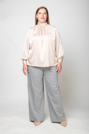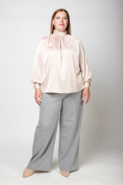 Блуза прямого, свободного силуэта. На переде выполнена драпировка по горловине в виде декора. Спинка со швом по центру и застёжкой на "молнию" по горловине. По горловине - мягкая воротник-стойка. Рукав втачной, длинный на манжете. По боковым швам небольшие разрезы. Длина блузы по центральному шву спинки - 65,0 см.
