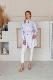 Платье-рубашка прямого силуэта. Рукав длинный, втачной, по низу рукава манжет с застёжкой на пуговицу. По горловине отложной воротник со стойкой. Спереди, от плеча, вдоль планки расположены защипы, застроченные до уровня талии. Застёжка на планки с пуговицами. Декоративная пуговица на планке , в качестве броши. Фигурные боковые швы с разрезами. Спинка рубашки со средним швом и кокеткой. Перед рубашки немного короче спинки. Нагрудная вытачка расположена в боковом шве. Длина изделия по центру спинки - 97,0 см. - для всех ов. Длина рукава -61,0 см., с манжетом - для всех ов. Манжет-5,0 см.- для всех ов. Длина переда , от плечевой точки , ближе к горловине - 94,0 см. - для всех ов. В наличии пояс-шнур для подчёркивания талии, по желанию. Ширина блузы на уровне груди - 52 р - 57,0 см., 54 р - 59,0 см.(половинка). Ширина изделия на уровне бёдер( половина) - 52 р - 62,0 см., 54 р - 64,0 см. Ширина рукава вверху - 52 р-18,5 см. (половина), 54 р -20,0 см. Использована ткань производства Турции, 50 % вискозы и 50 % п/э. Предлагается модель для отдыха, для каждого дня, а также для выходного дня. Можно носить как самостоятельную вещь, а можно комплектовать с брюками или с другими вещами.